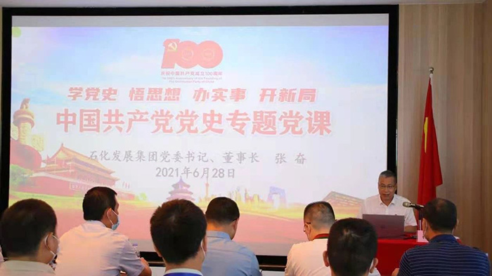 為深入推進石化發(fā)展集團黨史學習教育持續(xù)走深走實,以優(yōu)異成績慶祝中國共產(chǎn)黨成立100周年,6月28日下午,石化發(fā)展集團黨委書記、董事長張奮同志以“學黨史、悟思想、辦實事、開新局,深入學習中國共產(chǎn)黨黨史”為題,在集團黨群服務中心大廳為集團系統(tǒng)黨員干部講授專題黨課。在嚴格做好疫情防控措施情況下,集團全體黨員約60人參加了黨課學習。