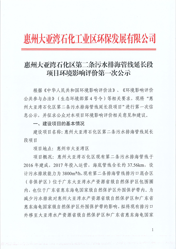 惠州大亞灣石化區第二條污水排海管線延長段項目環境影響評價第一次公示